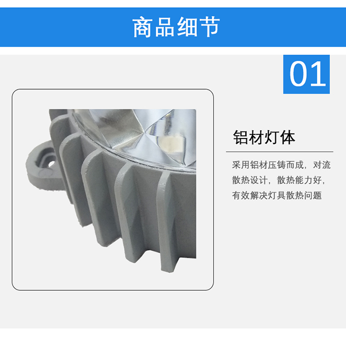 1、采用鋁材壓鑄而成,對流散熱設(shè)計,散熱能力好,有效解決燈具散熱問題
