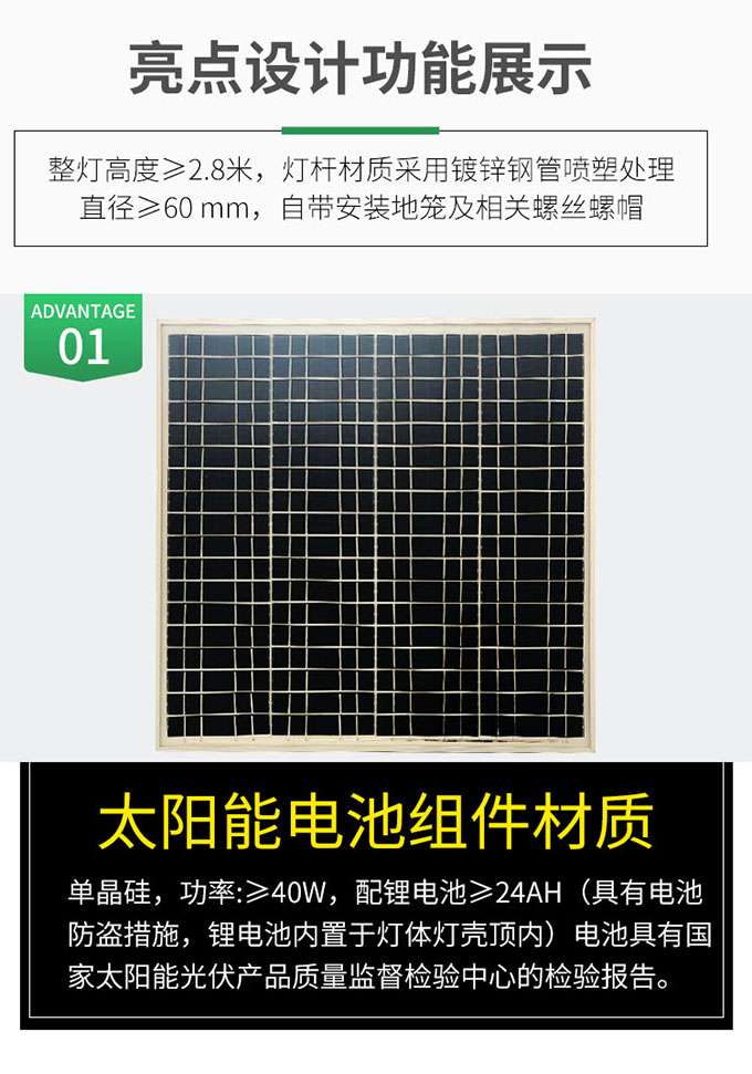 1.太陽能電池組件材質(zhì),單晶硅,功率:≥40W,配鋰電池≥24AH。