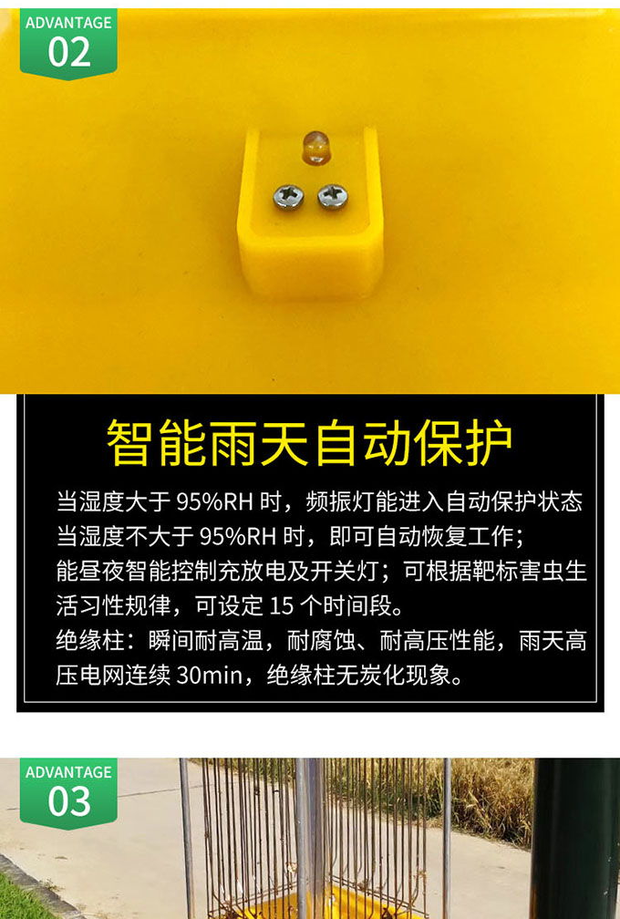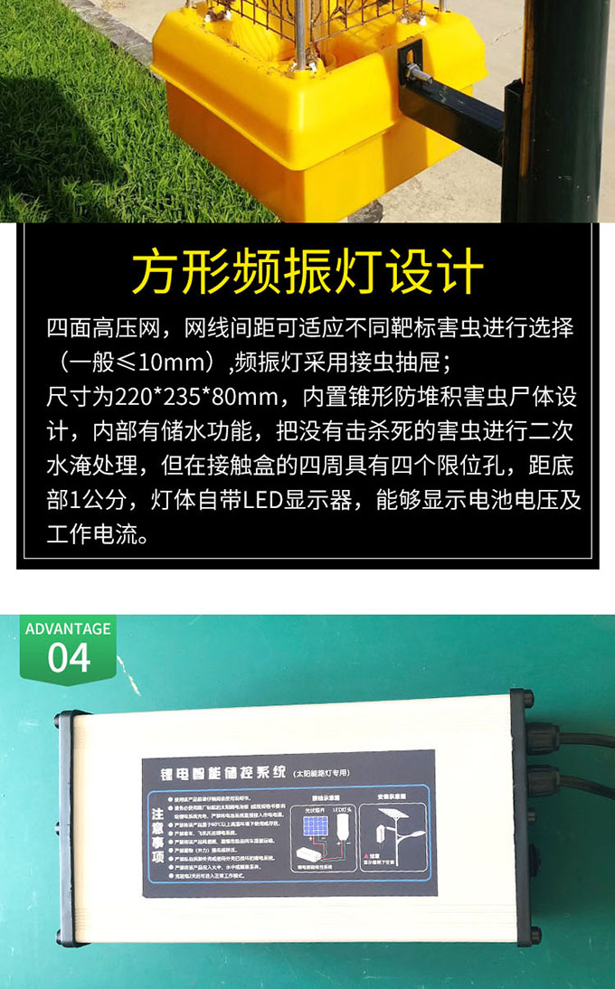 3.方形頻振燈設(shè)計(jì),可對(duì)害蟲進(jìn)行二次水淹處理。
