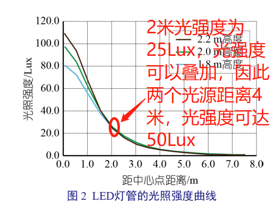 以 LED 燈 管 (18 W、2 100 lm、 6 500 K) 作為單光源對(duì)分娩舍內(nèi)的光源進(jìn)行 布置。LED 燈管的光照強(qiáng)度曲線如圖 2。分娩 舍所需的光照強(qiáng)度為 50 Lux ~ 100 Lux。從 圖 2 查得在地面距離燈管中心水平距離 2 m 處的光照強(qiáng)度為 25 Lux。根據(jù)光照強(qiáng)度的可 疊加性,將兩燈管的水平距離設(shè)置為 4 m,則 在兩燈管水平距離中心處地面的光照強(qiáng)度為 50 Lux,滿足分娩舍光照強(qiáng)度需求。